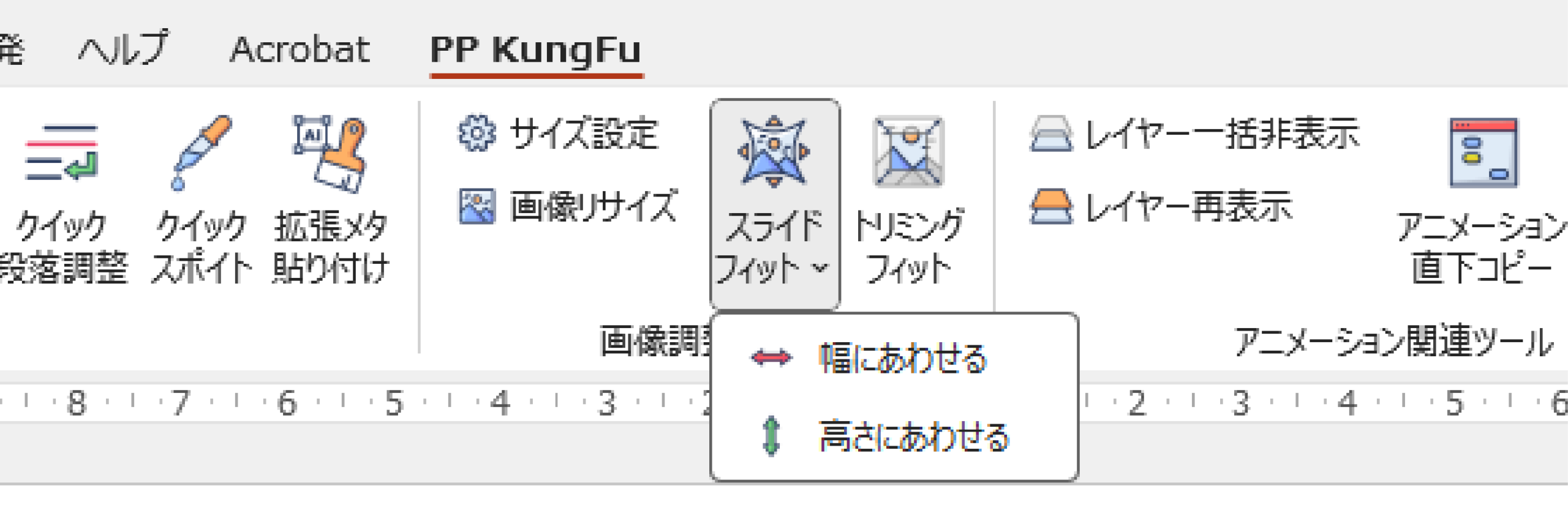 選択した画像やシェイプを、スライドの幅(または高さ)にあわせてフィットさせる機能です。