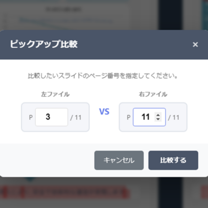 - 任意のスライド同士を選んで詳細比較できる「ピックアップ比較」機能