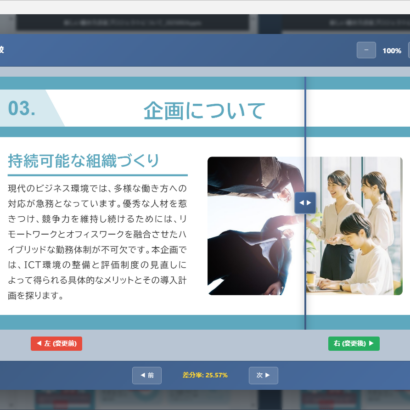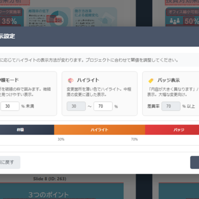 - 変更箇所を自動検出し、ハイライトで視覚的に表示